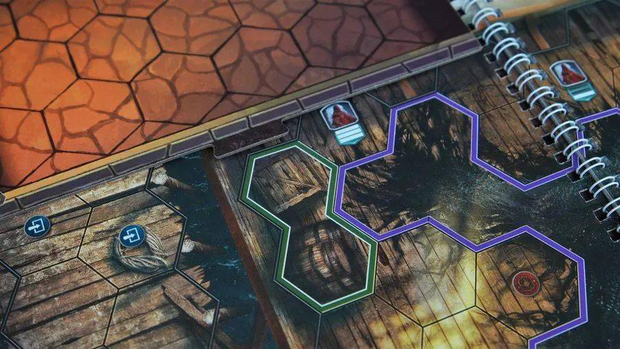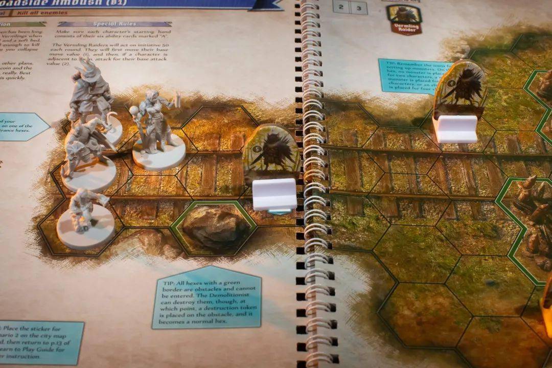 除了包含传统的游戏任务所需的剧情介绍、胜负奖励,英雄、反派、地形任务配置等元素外,《幽港迷城:雄狮蛮颚》剧本书的书页直接印有战场地图——也就是说玩家可执英雄模型、反派立牌直接在书上揭开战幕: