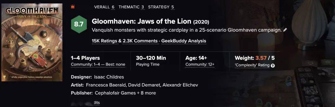 在前作《Gloomhaven》(下称《幽港迷城)取得BGG排名第一的史诗级成就后,游戏原出版社Cephalofair Games又于2020年带来了另一款基于《幽港迷城》世界观打造的合作冒险类游戏——《幽港迷城:雄狮蛮颚》: