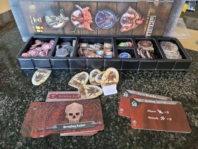 经过精心的设计和打磨,《幽港迷城:雄狮蛮颚》在美术上拥有了惊艳的呈现。无论是出镜率极高的游戏卡牌、生命/经验值转盘,还是用来收纳模型,角色信息的收纳纸盒,几乎每一款配件都印刻上了浓郁的魔幻风味~