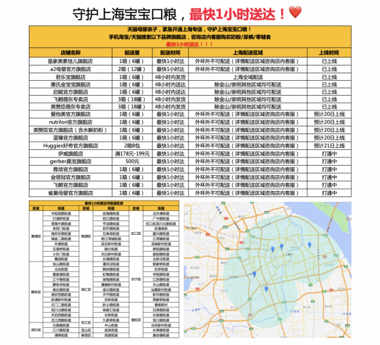 “这个月来,不断有上海的消费者向客服咨询,什么时候可以发货,但普通快递停运,我们也很着急。”天猫天猫母婴亲子小二宋增志一直在想办法,了解到天猫有一个“多级时效配送”产品,消费者在肯德基、必胜客、屈臣氏、优衣库等天猫旗舰店下单后,由线下门店发货,消费者在当天甚至1个小时就收到货,这套系统能不能用来给上海的宝宝送奶粉?