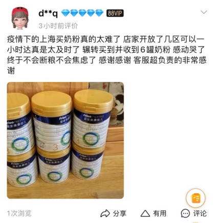 “在家一个月,宝宝奶粉快吃完了,常用的各种渠道都发不了货”,这些天,越来越多上海宝爸宝妈囤的奶粉告急,4月18日,家住上海虹口区建邦16区的丁小姐,偶然从朋友那里听说天猫开通了奶粉“上海专送”,就试着下了一单。“没抱太大希望,结果晚上7点44分下的单,9点08分就收到了!”