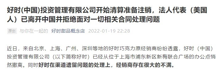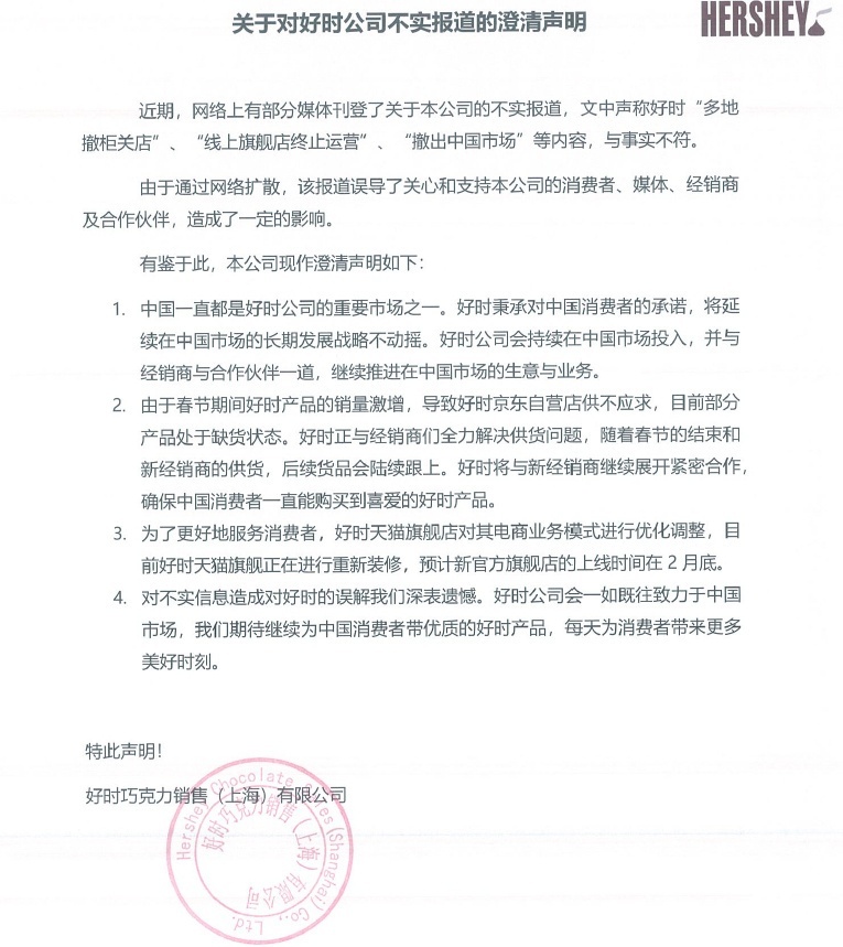 值得一提的是,今年1月,“好时甜品概念店”微信订阅号曾发文称,好时公司因调整中国大陆地区发展策略,拟缩减公司人数并调整中国市场规模,线下多地撤柜关店,好时法人已离开中国并拒绝面对一切相关合同处理问题,公司开始清算准备注销。