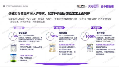 与此前相比,防敏品类日2.0时代的宝爸宝妈们建立了一定防敏认知。但面对广泛的过敏原,多数的宝爸宝妈们还没有专业的防敏意识以及应对措施,一旦宝宝出现过敏反应,他们就手足无措、身心备受煎熬。基于此,天猫国际母婴防敏品类日2.0,提出“一站式防敏育儿”的主张,以证据导向,建立正确的过敏管理,用科学专业的方式,实现早发现、早确诊、早干预、早治疗的专业一站式防敏。在诸多的防敏趋势中,奶粉防敏最为火热。在此次天猫国际母婴“世界奇育季之请回答防敏101”主题活动中,多家低敏奶粉品牌助阵,针对“安全低敏”、“预防过敏”、“治疗过敏”等需求提出了不同解决方案。