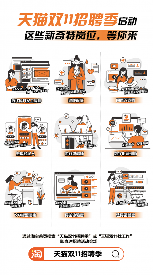 整个天猫双11招聘季,从10月21日持续到12月31日。用户可在天猫搜“天猫双11招聘季”和“天猫双11找工作”即可参与活动。本次招聘季将优先满足电商企业与商家的招聘需求,电商领域求职者将根据自己的需求匹配到合适的岗位,甚至是特色的“新奇特岗位”。如1号职场联合钉钉正在热推的“代码开发工程师”、“数字化管理师”,以及时下年轻求职者追捧的“角色原画师”、“品鉴体验官”、“选品运营官”、“游戏体验师”等多个新奇特属性职位。
