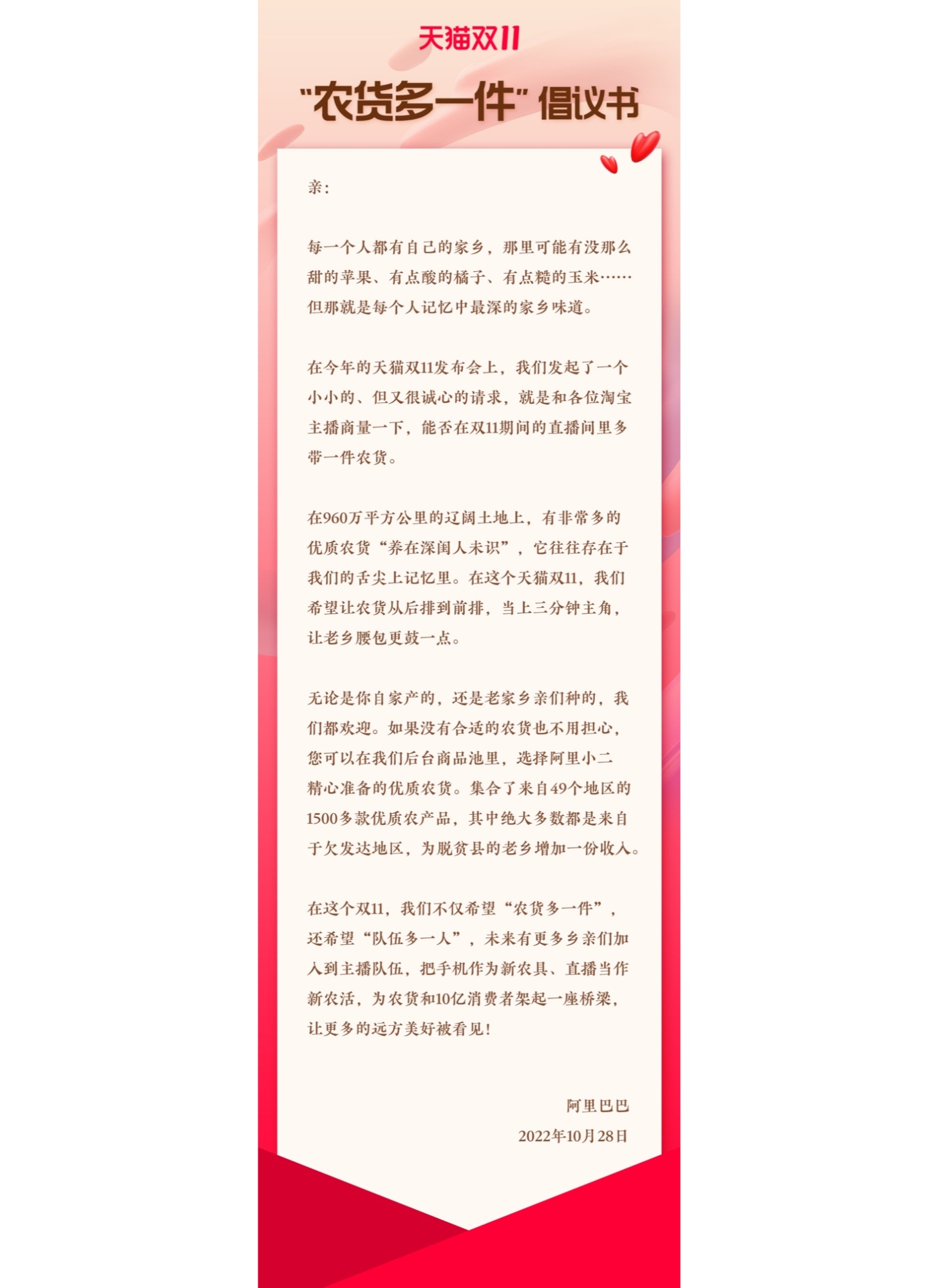 在10月28日举行的天猫双11“农货多一件”倡议发布会上,村播代表和天猫双11“农货多一件”项目组代表联合发声,希望天猫主播们能够在双11这个全球最大的消费季,在每一个直播间都能多带一件农货,让更多优质农产品被看到。