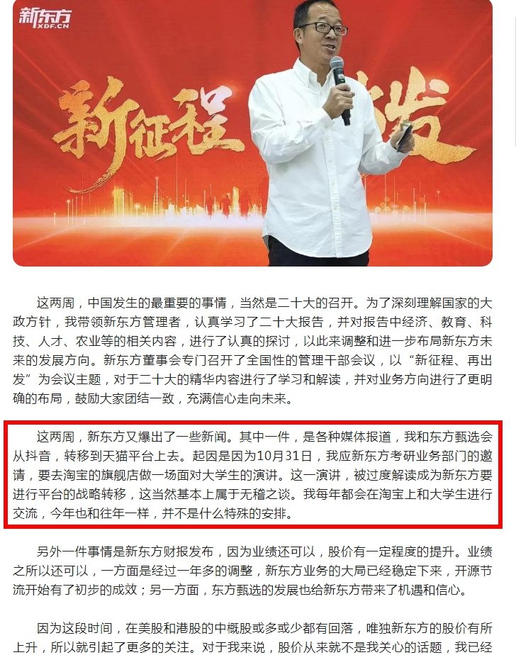针对外界猜测这是俞敏洪为新东方进行平台战略转移的先行探路,俞敏洪在微信号文章《内心有诗和远方,你就没有老去!》中表示:媒体报道我和东方甄选会从抖音,转移到天猫平台上去。起因是因为10月31日,我应新东方考研业务部门的邀请,要去天猫的旗舰店做一场面对大学生的演讲。这一演讲,被过度解读成为新东方要进行平台的战略转移,这当然基本上属于无稽之谈。我每年都会在天猫上和大学生进行交流,今年也和往年一样,并不是什么特殊的安排。