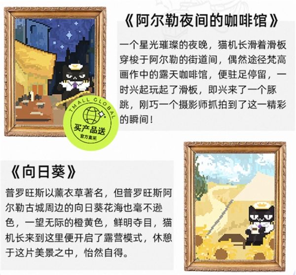 此次推出的数字藏品,以猫机长环球之旅发现宝藏好物和艺术为背景,带领大家把全球风光都纳入数字藏品中。猫机长的第一站是南法罗纳河畔的一座小城——阿尔勒,流连于梵高曾经作画的地方留下了《阿尔勒夜间的咖啡馆》和《向日葵》藏品,猫机长的第二站,携手Swisse斯维诗来到了被大自然宠爱的澳洲,猫机长与Swisse在探秘南澳的葡萄酒庄时,被这里的风光吸引,开启了瑜伽冥想生活,留下了《南澳葡萄园瑜伽》的藏品故事。