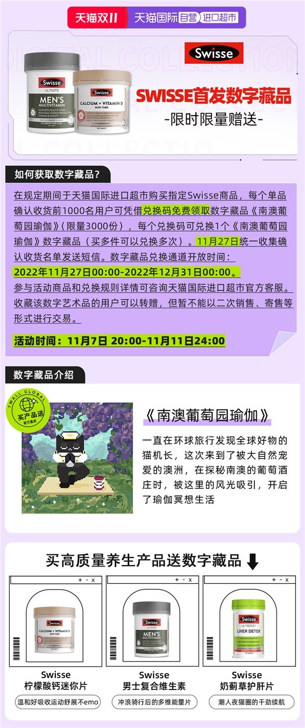 随着元宇宙概念的大热,众多品牌纷纷入局数字藏品市场,争先开辟新的营销策略。今年双十一,天猫国际进口超市也叩开了元宇宙的大门,于10月28日发布了天猫国际限量的数字藏品权益赠送给消费者,紧接着11月7日又联合Swisse品牌发布了品牌定制数字藏品。