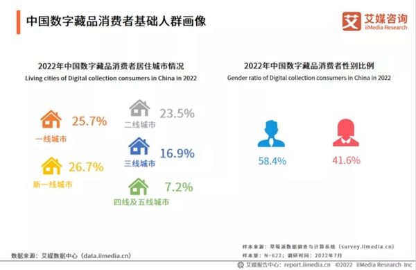 作为元宇宙时代下的产物,数字藏品不可复制、不可分割且具有唯一编号,受到越来越多人的喜爱,尤其是Z世代的热捧。据艾媒咨询2022年7月数字藏品数据分析显示:当前数字藏品对消费者特别是青年消费者具有一定吸引力,消费者购买数字藏品的三大原因主要为新颖好奇、看中未来升值、具有收藏价值。中国数字藏品消费者性别以男性为主,占比58.4%,新一线%,一线%,二线%。