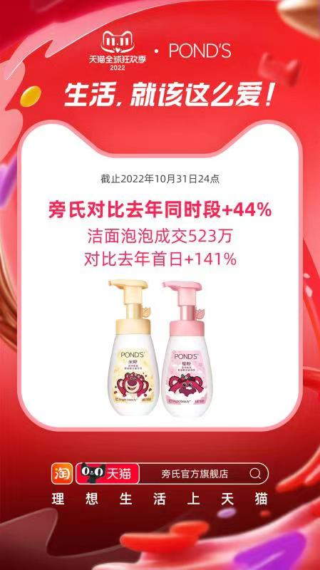 10月31日20点起,2022天猫双11全球狂欢季正式开启。丽人丽妆运营的旁氏官方旗舰店开门红增长44%,明星单品旁氏氨基酸洁面泡泡洗面奶首日成交额超500万元,同比增幅超140%。