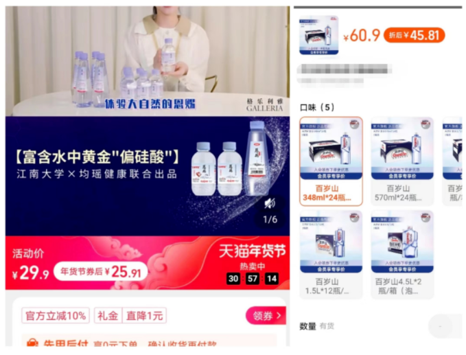 记者注意到,均瑶恩赐的饮用天然矿泉水售价相对“高端”。1月3日,“味动力”天猫旗舰店在售258ml规格的6瓶均瑶恩赐饮用天然矿泉水,券后价为25.91元;同日,饮用天然矿泉水头部品牌百岁山,其天猫旗舰店在售348ml规格的24瓶折扣价为45.81元。换算来看,均瑶恩赐的售价为16.74元/L,百岁山的对应售价为5.48元/L。两者的月销也天差地别,均瑶恩赐仅为14,百岁山则超3000。