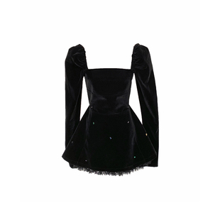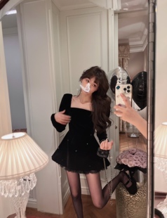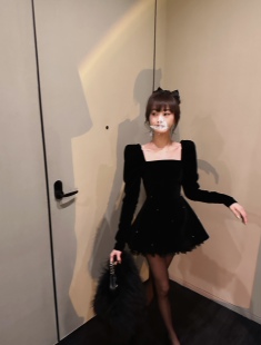 INMIMIFACE玄色方领寿辰丝绒连衣裙女冬季 收腰显瘦蓬蓬短裙子2023年1月30日