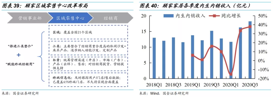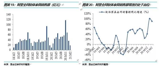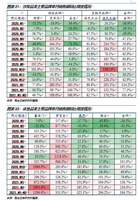■软体家居品类:软体家居行业延续2020年4月以来高景气度,线%。品牌层面,传统头部品牌、互联网品牌各有看点,其中头部互联网家具品牌源氏木语增长势头迅猛,1-2月同比增速176.5%。上市公司中,顾家延续2020年下半年线月官方旗舰店销售额同比增速87.6%,1-2月份同比增速49.7%。我们认为随着顾家对线上渠道的重视,官方旗舰店的角色逐渐由商品展示、引流线下转换为重要销售渠道之一。敏华控股旗下芝华仕官方旗舰店1-2月同比增长高达188.6%,公司线上大单品聚焦在功能单椅、中高端按摩椅,且中高价格带产品的销售额占比呈提升趋势,我们认为随着电商运营的发展成熟,公司线上渠道运营逐步由高周转引流策略转向高客单策略。