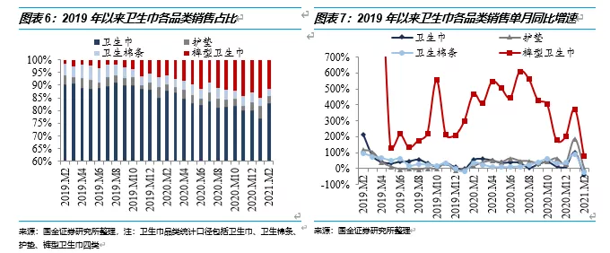 裤型卫生巾由于包裹性好等产品特性受到消费者青睐,加之产品利润弹性较传统卫生巾更好,成为不少品牌主推产品。据淘数据统计,2019年1月以来,裤型卫生巾在卫生巾品类占比中增幅最大,销售额占比也由1.8%提升至2021年2月的11.4%;裤型卫生巾单月同比增速全面领跑其他品类, 2月仍然保持高速增长,同比增速78.6%。