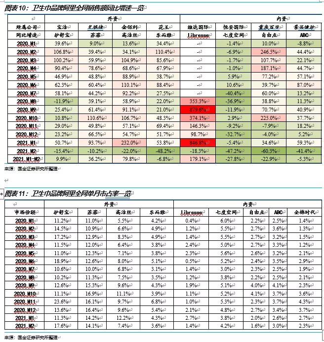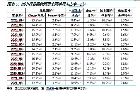 维达国际旗下两个子品牌增速继续呈分化态势。成熟品牌Vinda/维达品牌自2020年10月后增速放缓,2021年1-2月仍保持稳健增长,销售额同比增长7.0%,高于行业全网平均增速。维达旗下中高端品牌Tempo延续高双位数增长,Tempo 2021年1-2月阿里全网销售额同比增长28.9%。阿里全网市占率方面,Vinda/维达稳居品牌第一,维达国际旗下两个子品牌2月市占率合计达16.2%。■