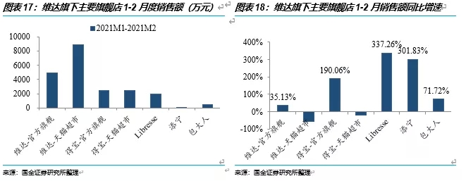 分分店铺来看,自营官方旗舰店表现突出, Libresse、添宁1-2月销售额同比增速均超300%,其中高端卫生巾品牌Libresse旗舰店表现更为靓眼,销售额同比增速近337.26%,维达、得宝天猫超市销售同比增速略有下滑。