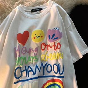 T恤女宽松中性风圆领上衣ins百搭打算感幼多 创意字母印花短袖 夏令天猫